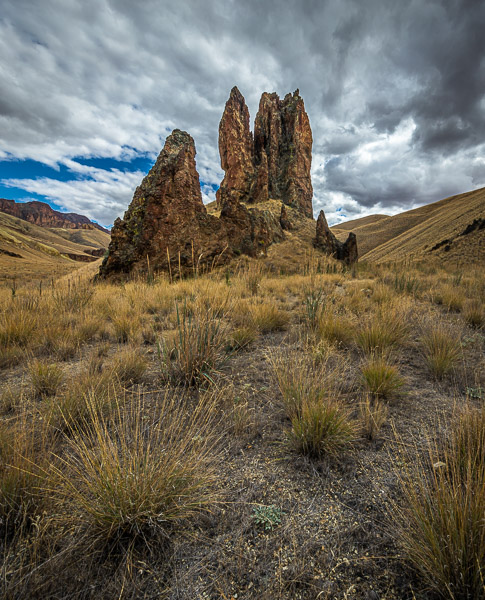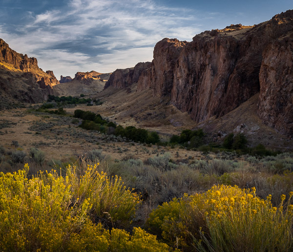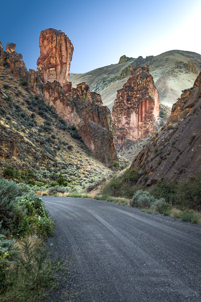 The Owyhee Canyonlands, in the remote SE corner of Oregon, have long been on my radar to explore. So, when cooler temperatures arrived this September, friend Andy & I headed out to explore them. That area’s Leslie Gulch was especially enticing, with descriptions of fantastical volcanic towers and gorges which sounded similar to Smith Rocks’. And while we did find Leslie Gulch (& Succor Canyon) beautiful, especially when accented by blooming rabbit brush, we found it difficult to capture photographically. And the open range cattle had produced clouds of oppressive flies. So, after 3 days we headed back toward Bend, but not before putting Starr through some serious off road challenges. One was a very steep and rocky ATV track up to the base of Three Fingers Rock. Starr had no problem handling it, except that he decided to have his air intake hose come loose near the top and thereby loose all power! After a few panic-filled minutes (“how are we going to get a mechanic up here?”), Andy found the disconnected hose and all was well again.