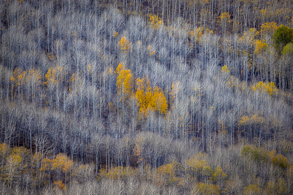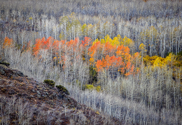 With our unseasonably warm weather, I had been in a quandary when to schedule my annual aspen color trip to Steens Mountain. The peak leaf color usually occurs for 2-3 days within a 3 week window centered around the first week of October. And since timely firsthand reports are very rare, it’s a crapshoot when to take the 6+ hour roundtrip drive. With cooler stormy weather finally forecast, I departed on the 13th — more than a week later than usual. Upon arrival, it turned out that I was at least a week late for the high altitude aspen, and a few days to a week early for the aspen at the bottom of the Steens gorges. And it didn’t look like it was/will be a real colorful year for either. I did find a small pocket of high altitude color off in the distance and, after a moderate hike, I at least came home with a few decent images.
